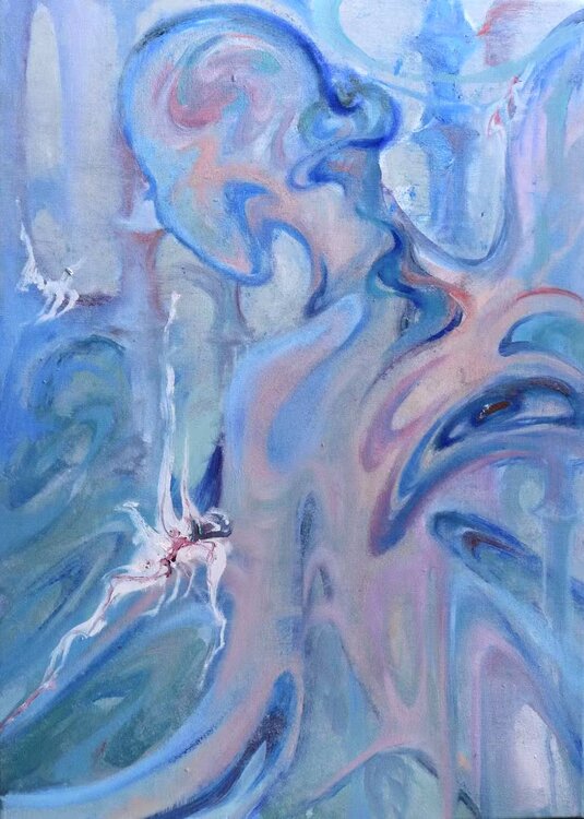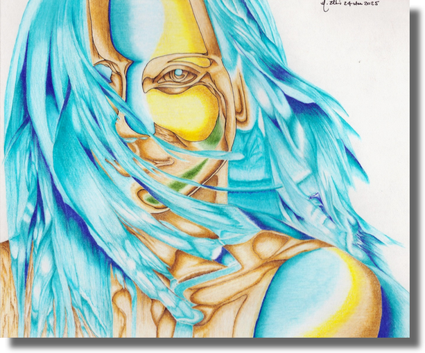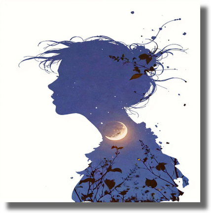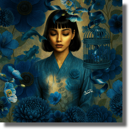 “I am a visual artist drawn to the quiet tension between seen and felt, working at the intersection of emotion, identity and symbolic form. My work explores the emotional language of color and the silent presence of feminine identity. Through mixed media digital collage I create dreamlike portraits where women are defined not by facial expression but by aura, texture and hue. Blue, in this case, becomes more than a color — it is memory, stillness, introspection and truth. Each piece in this trio represents a facet of the inner world, shaped by the quiet power of being. I aim to evoke emotion without overt narrative, allowing the viewer to connect through mood and atmosphere. Aokage captures the quiet presence of solitude. Aiyume unfolds in a realm between waking and sleep. Kansō is a portrait of inward perception.”