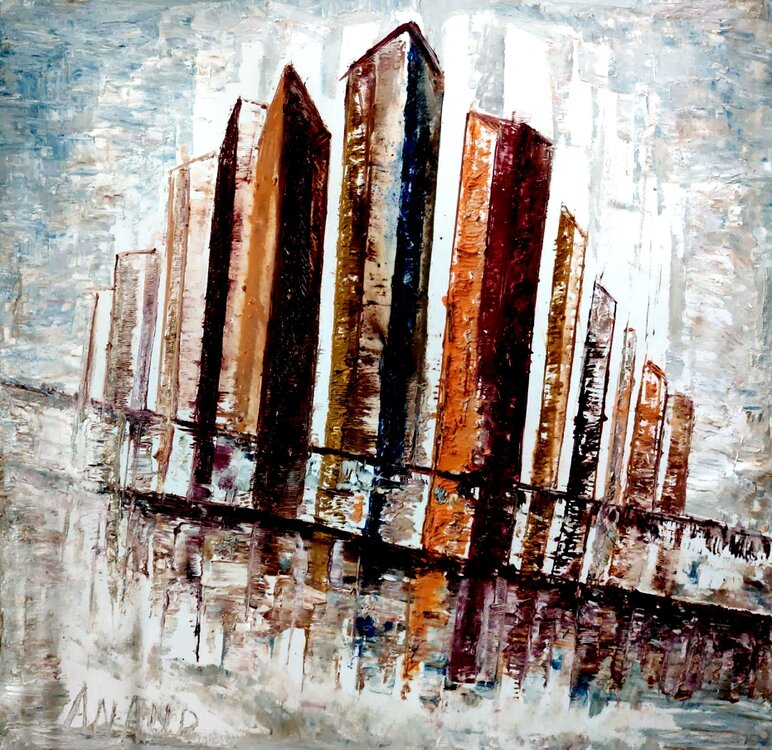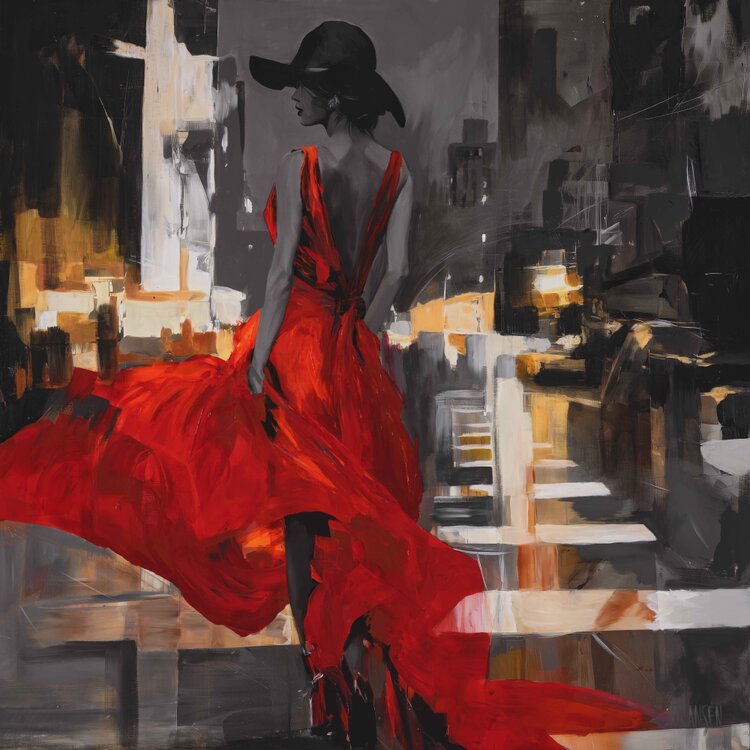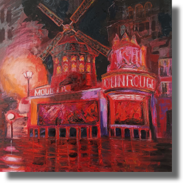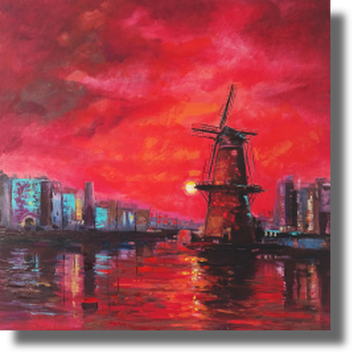 “In this series I present the urban landscape as a living, breathing entity, united by the symbolic presence of the mill and the energy of the color red. My work explores three distinct urban states. 'The City's Soul' captures the city as light, where the mill acts as a warm, sacred beacon amidst the hazy silhouettes. 'The Eternal Guardian' shifts the perspective to drama and endurance, portraying the mill as a silent observer above the rhythmic, EKG-like skyline of an industrial zone. Finally, 'The Heartbeat of Montmartre' celebrates the city as a festival of passion, where the iconic Moulin Rouge embodies the night’s movement and cultural pulse. Through bold impasto oil strokes and a vibrant palette, I aim to show that the city is not just stone and steel but a constant flow of light, history and emotion.” — KSELMA RANDVALD