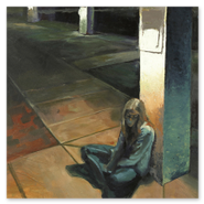 "DRIVE says something. It says a portion of the whole is now the whole itself. It is a rectangular fragment like a puzzle piece which dared to escape from its greater body. It endured doubts but has successfully asserted its independence and formed a distinct identity and purpose of its own. It transcended existing as a partial representation of an object and chose instead to become art. The space is divided into horizontal bands which are broken by the quarter of the wheel on the bottom left and the vertical strip of chrome reaching the top on the right. The round, colourless wheel and its intricate details contrast the straight lines and deposit visual weight in an unlikely location. This situation is solved and balanced by the arresting blanket of flat colour above which holds down the composition and warms up the hard, metallic materials and the ample, black shadow below. The emblem could easily be the prize ribbon pinned on this unique and irresistible artwork which promises a classic, pink and oh so smooth ride." -- GALLERY RING