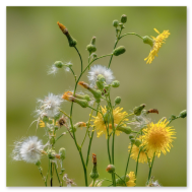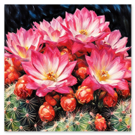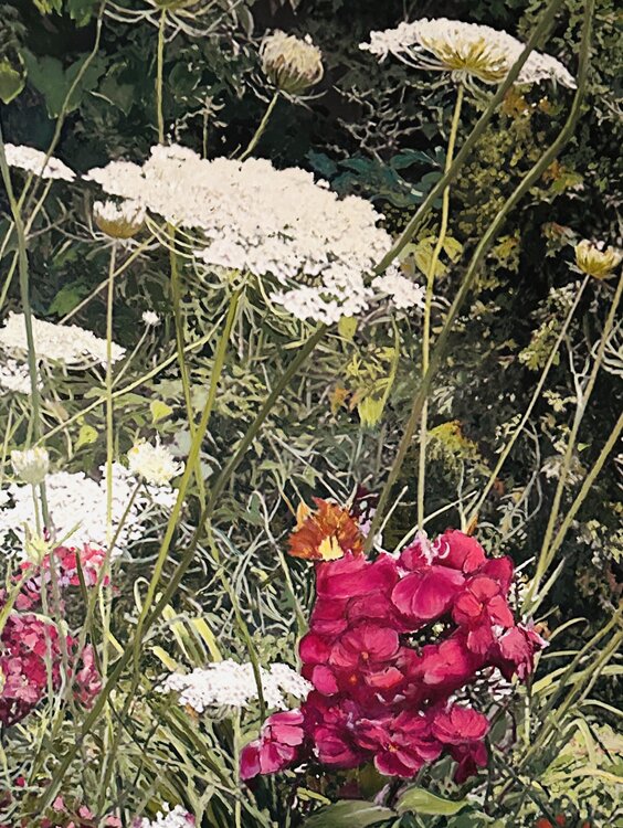 “My current oil paintings of colorful, engaging but otherwise overlooked and isolated flora are magnified to reveal their importance. My subject matter is discovered from remote to obvious locations across the country. Coming from an orientation in abstraction, my choice to work in a close-focus, hyper-realistic style remains ever mindful of the abstraction that exists in nature. These paintings examine mark making and the nuances of color and light in nature. This process involves the close observation of many aspects of landscape and the amplification of these images. They magnify a moment in time and in nature, when plants are at the peak of their reproductive cycle and are fully asserting their seductive beauty/perfection/ splendor/ripeness. The focus has been on select blooms to show the importance of their smallest components.” — MARJORIE MOSKOWITZ