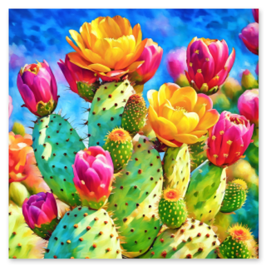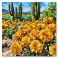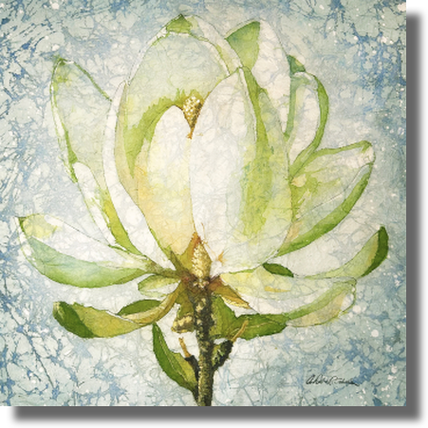 “Capturing the light is everything! I love the journey for the next inspiring image and how I can interpret, embellish and re-invent it. I love nature and live in a very rural area of Arizona. When I choose an image, I first observe the drama of the light, color, shadow and reflection. I assess the image by the story or message and how it will look in the batik style. The WATERCOLOR BATIK ON MULBERRY PAPER method is a loose painting technique using watercolor and melted wax as a resist on a tissue thin paper. It emphasizes an energetic texture and a bit of whimsy. The process involves alternating layers of watercolor and wax and there is a progression from light to dark values, each time adding wax to reserve the area after it dried. Once the layering process is complete, the wax is removed and the final art piece is revealed.”