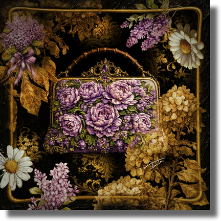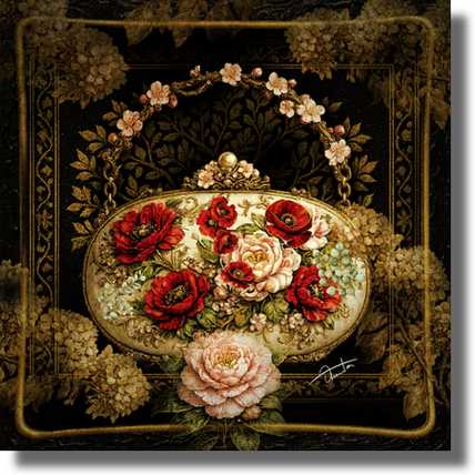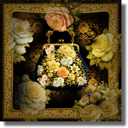 “My work invites the viewer to see art objects, vintage accessories and statement garments not as surface decoration but as a living archive where heritage, care and reverence continue to unfold. The series "Rugs & Reverence" is articulated through two interconnected realms: "Creatures of Memory" and "Objects of Devotion". The submitted works are under the "Objects of Devotion". Floral forms and handcrafted objects become symbolic vessels, carrying personal memory and cultural continuity across time. Drawing from historic textiles, ancient rugs, botanical symbolism and heirloom details, each piece is composed as a quiet act of preservation. Through digital artistry, I re-imagine these objects while honoring their ceremonial presence. They are not simply decorative forms but reflections on what is carried, tended and remembered. Each artwork centers on a devotional object—handcrafted bags of my own design—composed alongside floral symbolism and historic textile references that function as carriers of memory.”