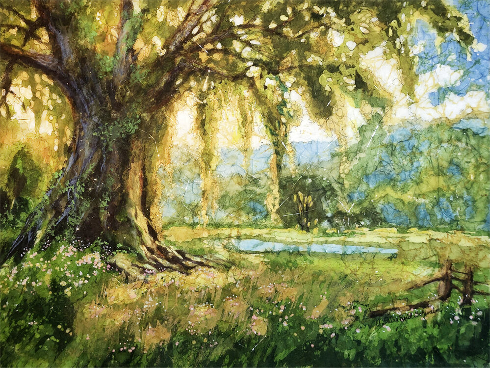“I love the journey for the next inspiring image and how I can interpret, embellish and re-invent it for the batik process. Watercolor Batik Process: Hot wax is used as a resist on paper or (in my case) mulberry paper. Using watercolors, a light to dark paint technique is used to layer watercolor and wax. Capturing the light is everything. The final results of the textures and transparency is amazing. I like to incorporate a sense of magic, whimsy and GLOW to my art.” — A. DEBRA REICH SCHWALM
