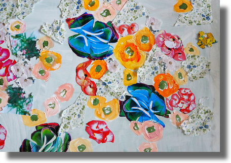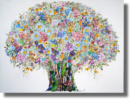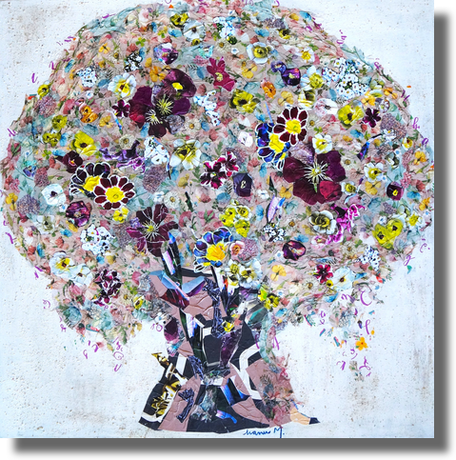 MM — Collage allows me to bring together different materials and textures. I love moulding, wrinkling and crumpling different types of papers — which I collect from everywhere in the world. It's like playing spontaneously, reinterpreting the world. Before talking about my technique, I need to explain my passion for photography. I feel inspired by any shape, form, colour, unusual compositions, buildings, including decayed walls or graffiti. Once I decide on the character of the garden or the bouquet, I work on collecting the necessary materials — a variety of papers — Japanese, English, European, prints of my photos, paper painted by myself and — rarely — magazine pages. It is a time-consuming task. My process consists of applying moulding paste with a palette knife to create the main flowers in the composition and then I let it dry. Meanwhile, I work on collaging the specific attributes of the garden. Once the moulding paste is dry, I paint it with acrylic in my colour of choice. I continue to collage the papers to create the background until the whole surface is covered. I balance the composition by adding layers to the main flowers until I feel it is done.