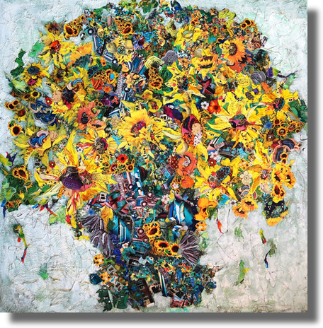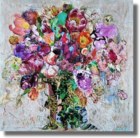 Learn how a clinical career as a pharmacist didn’t interfere with this vibrant artist’s unstoppable inclination to create art and express beauty in her own abundant and irresistible way. You are invited to wander, linger and get lost in her seductive and luscious gardens from around the globe which overflow with copious colour, scrumptious flowers and delicious, decorative and rich details. Come and admire unique and intriguing bouquets teeming with surprising components and discover the process and intention behind these lavish collages — right here in the following feature and interview which was created in recognition and celebration of her CRYSTAL ARTIST OF THE YEAR 2025 title.