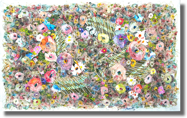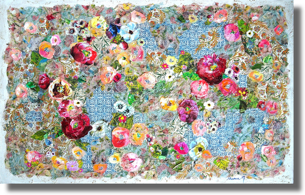 MM — I became particularly inspired by motifs such as Spanish and Portuguese tiles as well as Florentine Renaissance floral motifs and ornamentation. These elements moved beyond their original function as separators and became active participants in the composition, carrying cultural memory and visual richness. This transformation reflects my ongoing interest in layering: blending observation, travel, cultural research and imagination into a unified visual language. Spanish tiles are not only a symbol of beauty but also a reflection of the country's rich cultural heritage. In Walking In The Spanish Garden (now in a private US collection), the blue tiles are not only decorative — they amplify the abundance and serenity of this environment. Regarding the method used in this piece — and actually in all my series — I worked with papers collaged on to the canvas, moulding paste to define the textured flowers and realistic photos, taken by myself during my travels, with recognizable magnolia/zinnia/cosmos fleurets. It is a mixture of techniques and materials I truly enjoy exploring. This complex layered approach made me discover something essential about myself — a deep capacity for patience. It supports the richness of detail and the sense of balance that I want to achieve in my gardens.