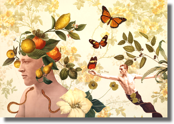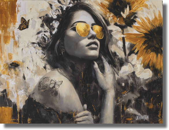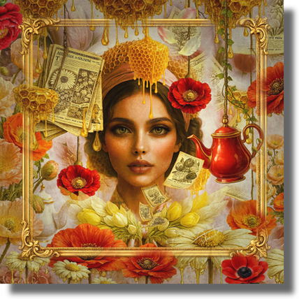 "In Mellifera, I explore seasonal awakening as both renewal and quiet resilience. The honeycomb crown suggests unseen industry and collective labor. Though no bees appear, their presence is implied in the dripping gold — sweetness born of persistence. Honey nourishes, yet the idea of the sting lingers beneath it, a metaphor for the courage required to rise and defend life again after stillness. Poppies, daisies, peonies and tulips bloom among vintage botanical pages, like announcements heralding a new season and the promise of hope. Two teapots suggest a shared ritual — the passing of news, warmth and sweetness between souls. Encased in a gold frame, the muse appears deliberately posed, as if this moment is being formally declared. The frame does not freeze time. It acknowledges a recurring truth that renewal, memory, warning and beginning are constants in the human cycle, repeating across seasons and across us. This work is part of The Seasons – Special Edition series."