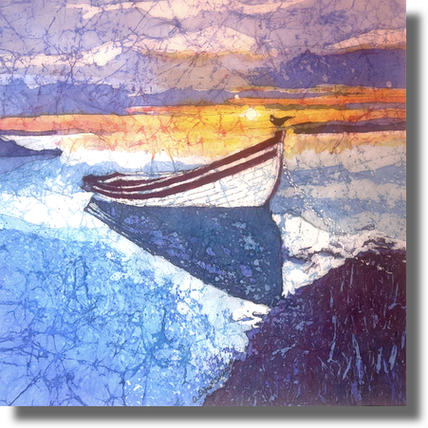 “Capturing the light is everything! I love the journey for the next inspiring image and how I can interpret, embellish and re-invent it. I love nature and live in a very rural area of Arizona. When I choose an image, I first observe the drama of the light, color, shadow and reflection. I assess the image by the story or message and how it will look in the batik style. The WATERCOLOR BATIK ON MULBERRY PAPER method is a loose painting technique using watercolor and melted wax as a resist on a tissue thin paper. It emphasizes an energetic texture and a bit of whimsy. The process involves alternating layers of watercolor and wax and there is a progression from light to dark values, each time adding wax to reserve the area after it dried. Once the layering process is complete, the wax is removed and the final art piece is revealed.”